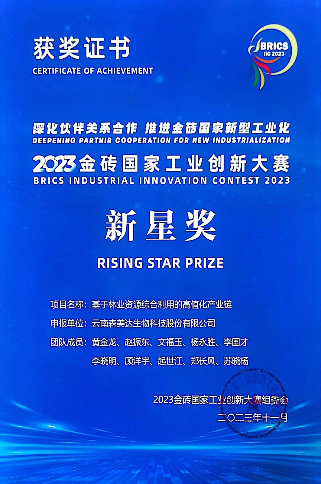 After fierce competition with domestic and foreign projects, our project "High Value industrial Chain based on Comprehensive utilization of forestry resources" won the Rising Star Prize of this BRICS Industrial Innovation Competition on the "Green cycling" track. Aiming at the problems such as prominent resource advantages of eucalyptus, low comprehensive utilization rate of raw materials and poor terminal research and development of Yunnan's characteristic forestry resources, the project team researches and develops plant-derived biopesticides, mosquito repellent for sanitary pesticides and feed additives with eucalyptus leaf extract as the effective component through industry-university-research cooperation. The products have been tested and promoted in Hainan, Yunnan, Jiangxi and other provinces in China, and have gained a good reputation.